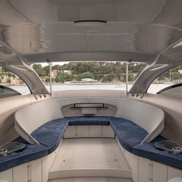 The luxury motor yacht “Arrow460–Granturismo” can accommodate up to 10 persons. The large side windows are retractable, and the windscreen can be raised. This means that passengers can sit comfortably in the interior while enjoying an all-round view and the feeling of sitting in the open. As standard the yacht is equipped with every feature an owner might wish for. Wood serves to line the entire interior, rather than this material being used as a conventional floor covering. As a result of this three-dimensional application of wood, the fine grain of the eucalyptus follows the overarching forms of the interior lining, underscoring the overall flow of the interior. The luminous transmittance of the glazing can be controlled electronically, along the same lines as the Mercedes-Benz MAGIC SKY CONTROL technology; at the same time, the silver-shimmering glazing blends apparently seamlessly into the overall profile, as on the Mercedes-Benz concept vehicles F015 and Concept IAA. This avant-garde appearance underscores the sculptural and innovative character.